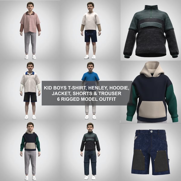 3D CLOTHING KID BOYS T-SHIRT, HENLEY, HOODIE, JACKET, SHORTS & TROUSER 6 RIGGED MODEL OUTFIT