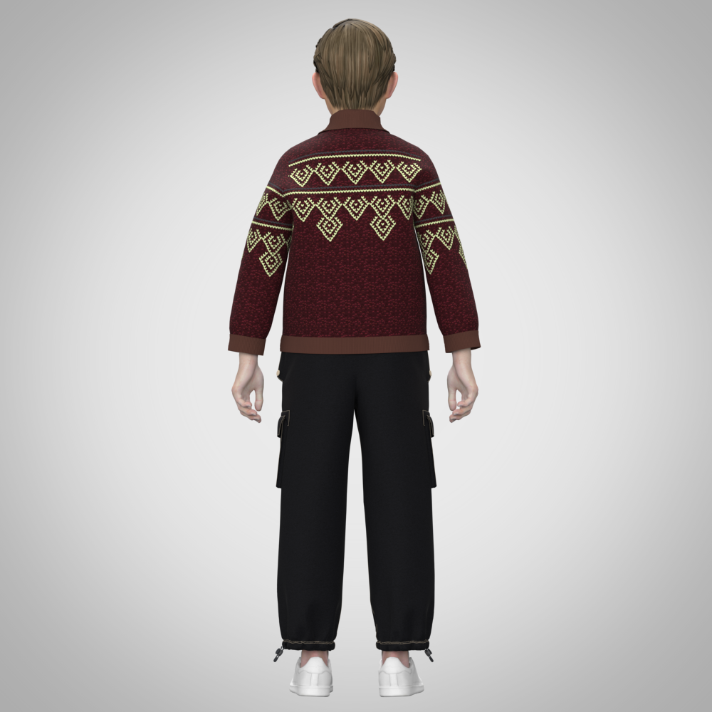 The Boys Cardigan Sweater has been meticulously designed in CLO 3D, ensuring industry-grade accuracy in proportions, stitching, and fabric behavior. The garment includes realistic fold simulation, layered rib textures, and authentic knit pattern detailing for a natural and tactile appearance.
