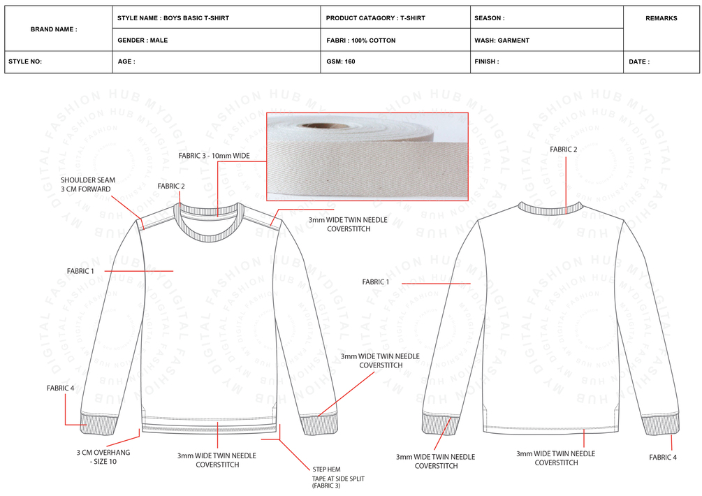 • Bill of Materials (BOM): A complete list of all materials required, including main fabric, ribbing, threads, and labels.