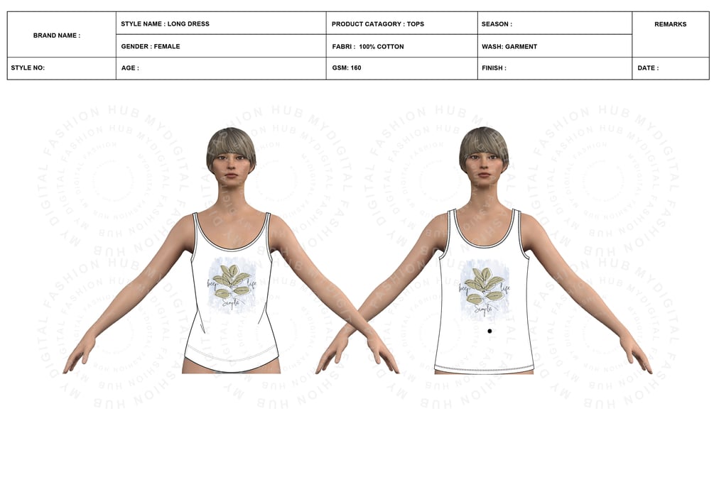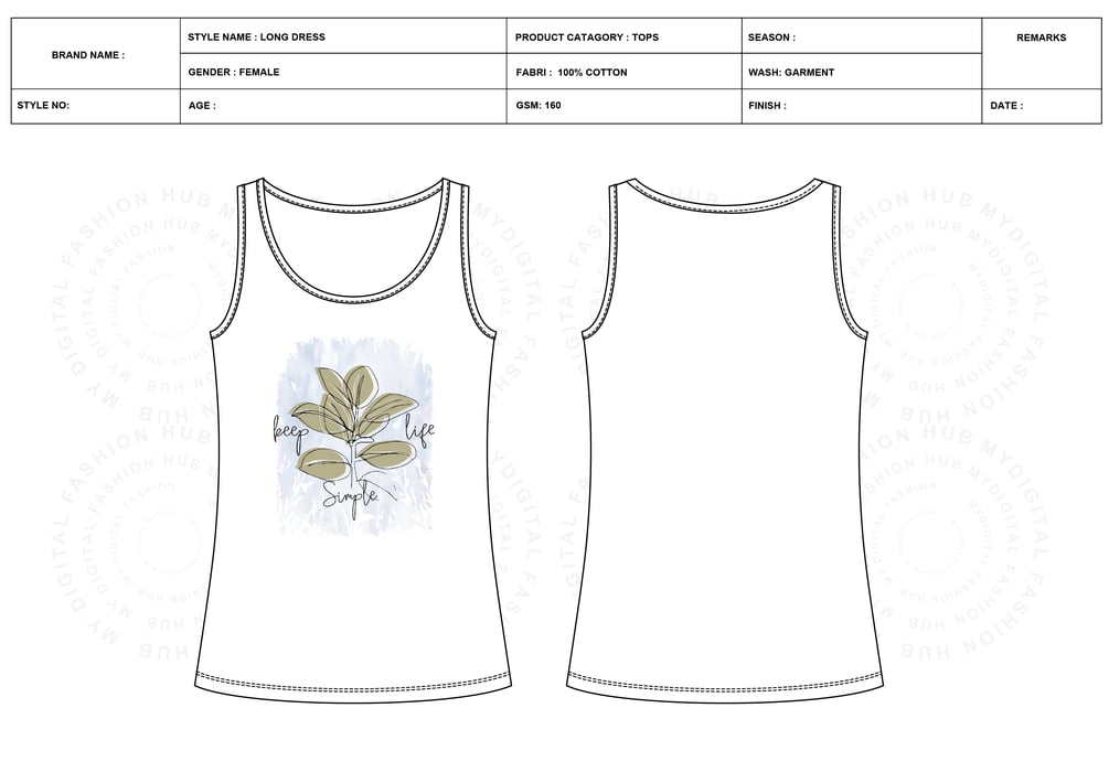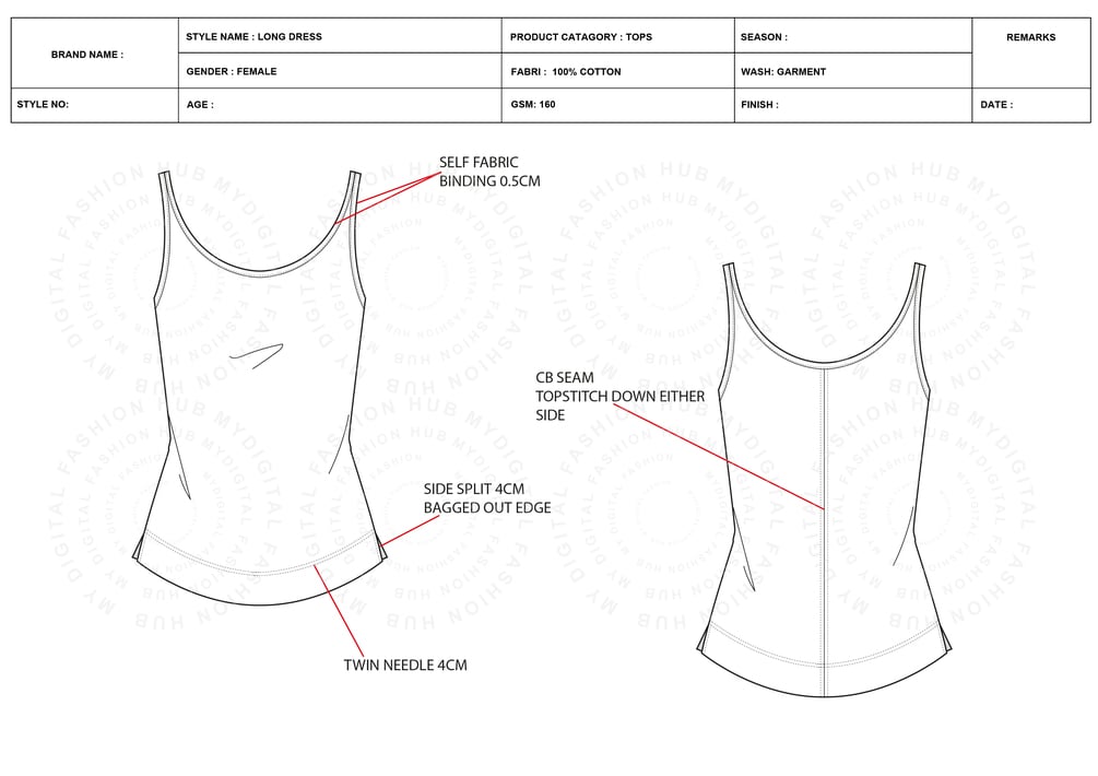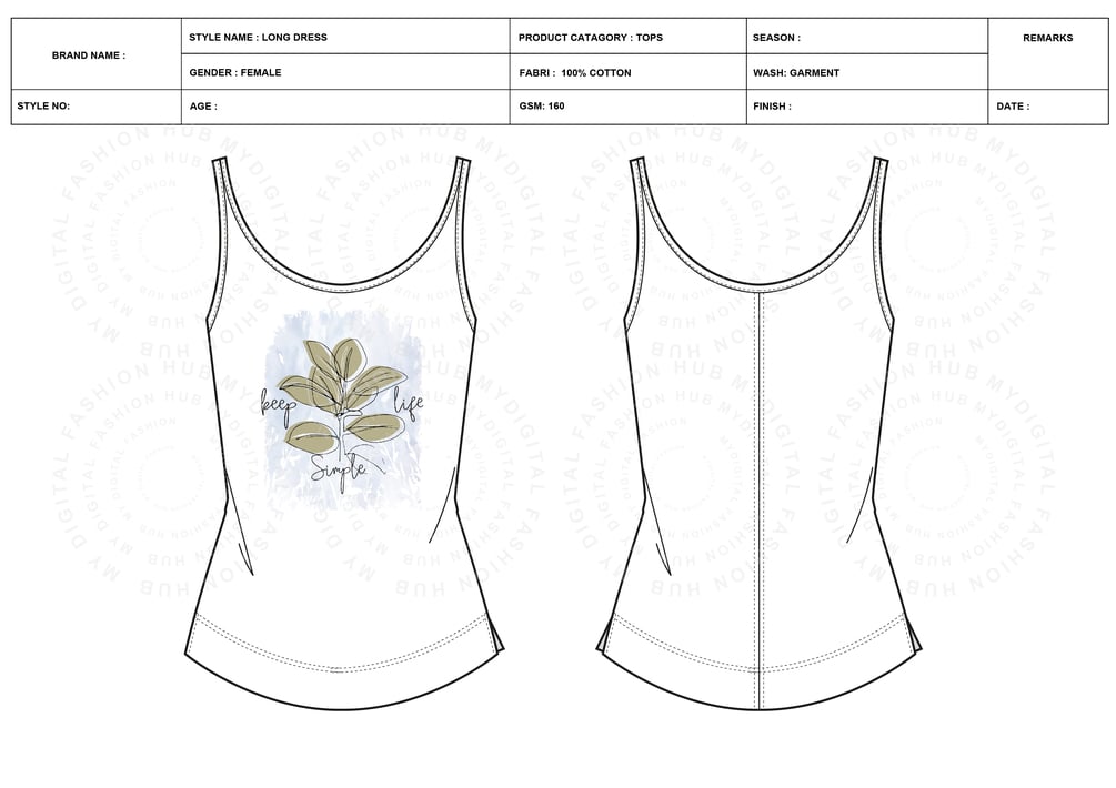 This tech pack centers around a classic and flattering silhouette, featuring a scoop neckline and standard armholes, making it a versatile base for numerous styles. Every element is designed to be fully editable, allowing you to modify fit, proportions, fabrics, and design details to align with your brand’s creative direction.