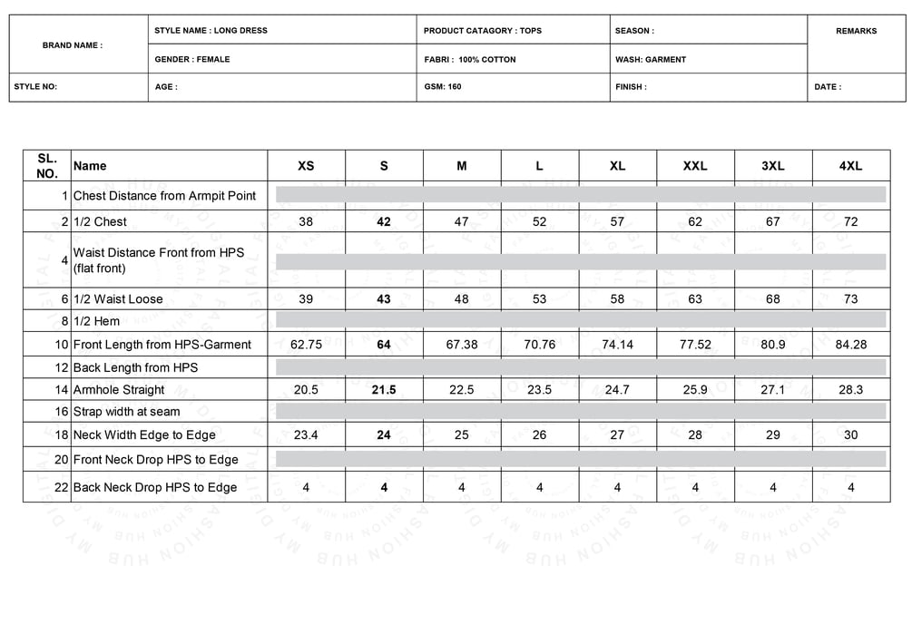 - Visual guides illustrating how to measure key areas such as chest, waist, hem, and strap width.