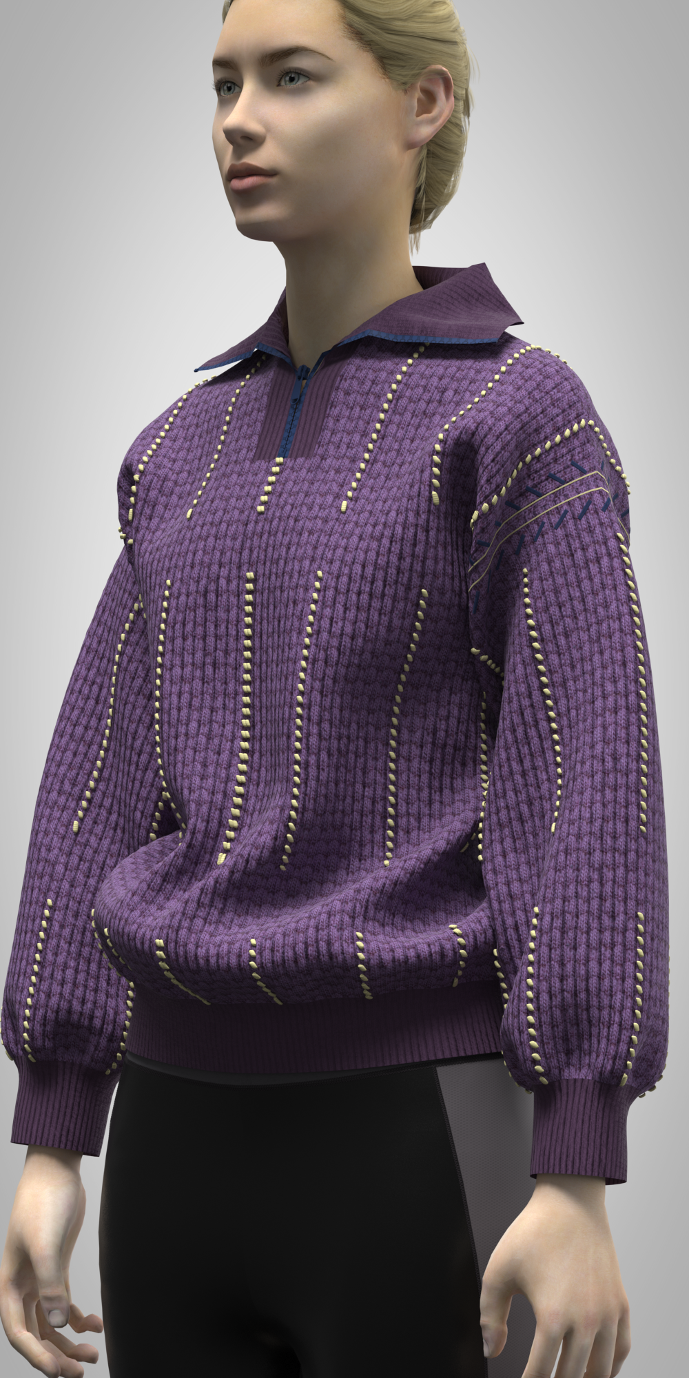 A clean and modern 3D women’s half-zip sweatshirt ideal for digital fashion design, animation, and metaverse styling.